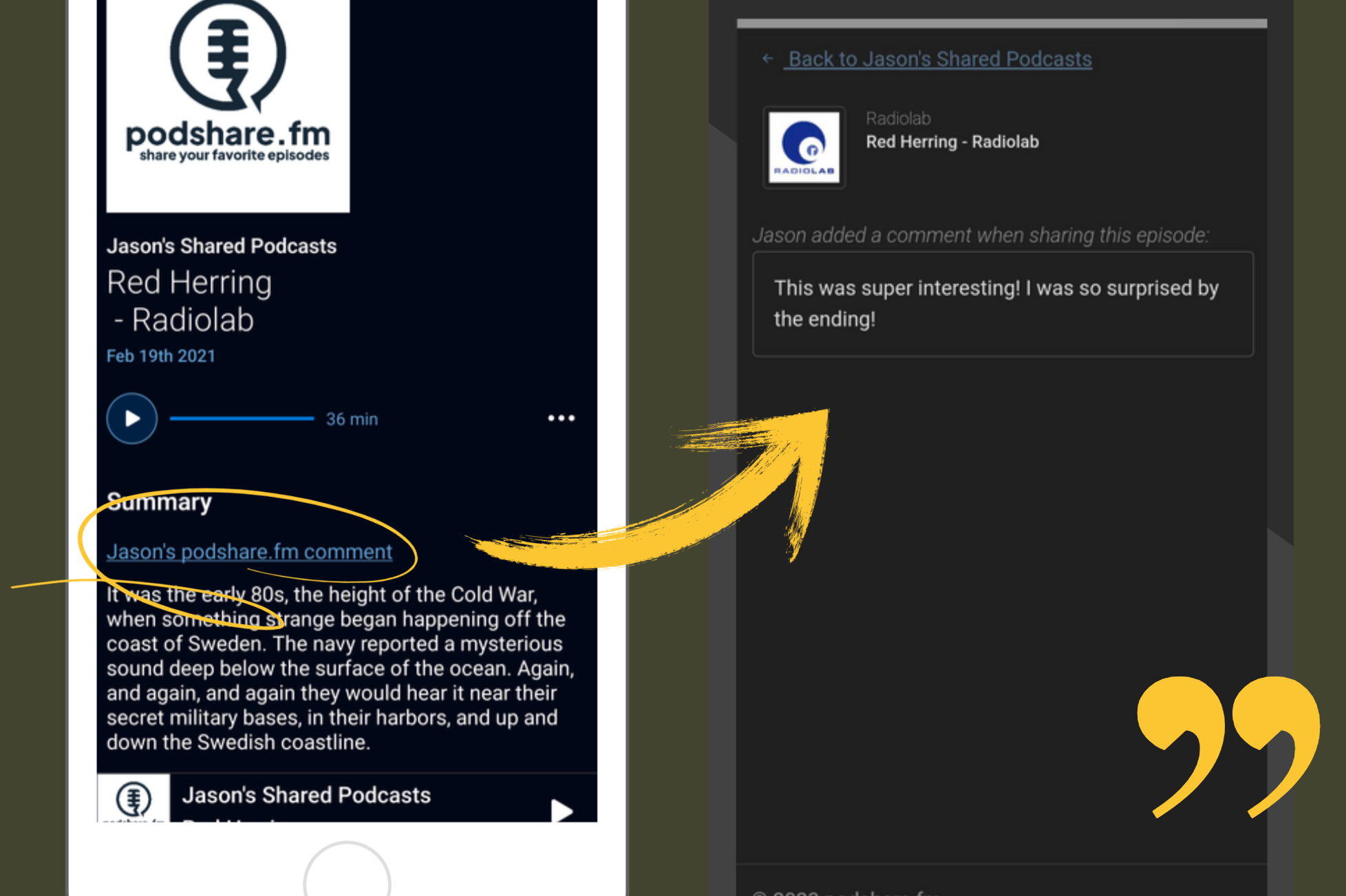 Add a quick note about why you liked the episode you're sharing. Friends can easily tap to see what you wrote directly from their podcast player.